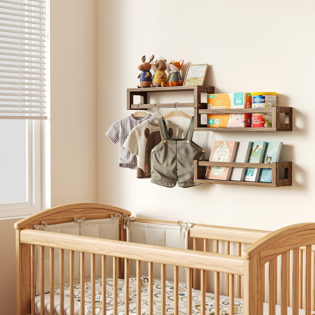 Floating shelves are great for books, decor, and everyday baby items.