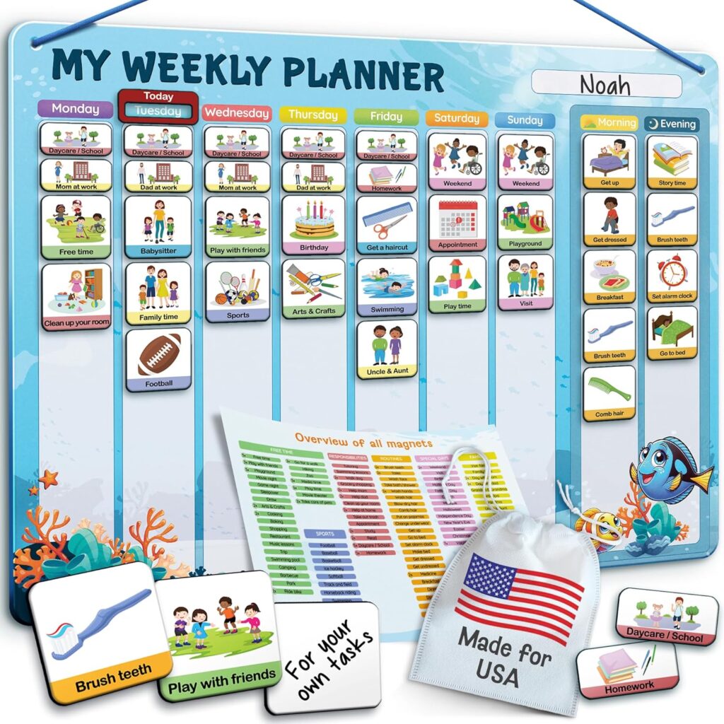 Another thing that has really helped is our weekly planning board. Every Sunday, we sit down together and go through the week. We talk about which days he goes to school, what happens after school, and when the weekend is coming. In the evening, we move the arrow to the next day together, so he can visually see what’s coming.